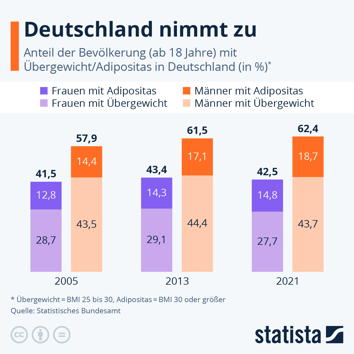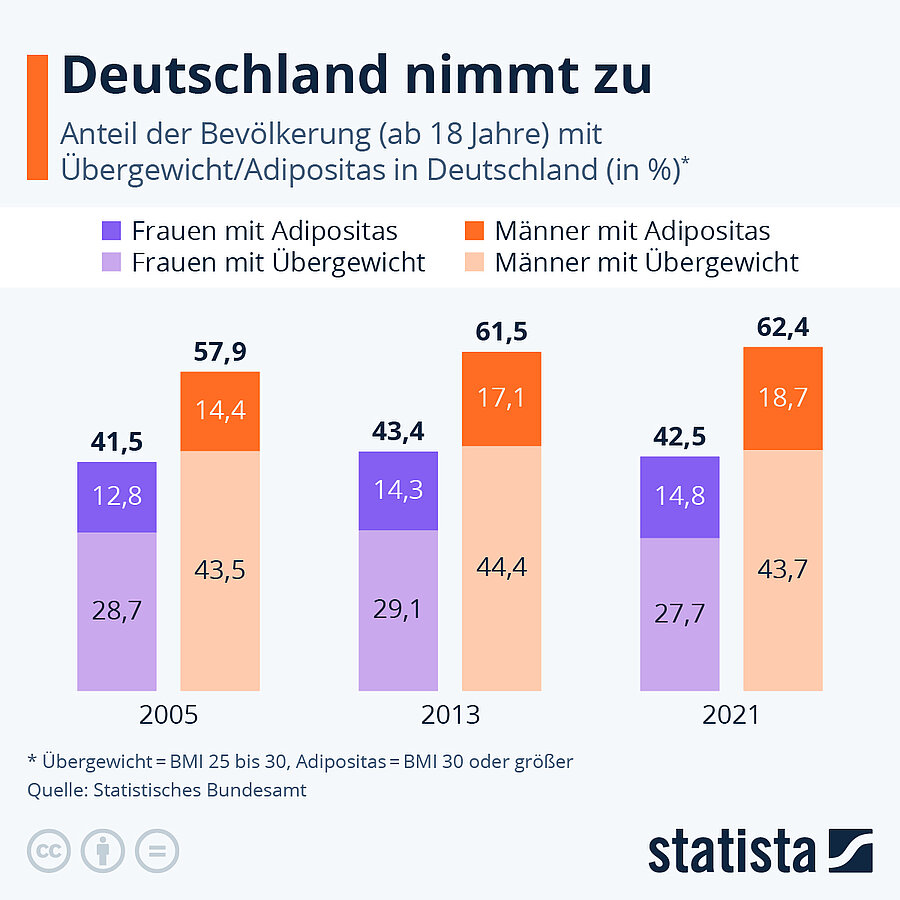 Die Bestatter haben es nicht leicht. Die Menschen werden nicht nur größer, sondern auch immer schwerer. Der Anteil der Übergewichtigen hat in den letzten Jahrzehnten deutlich zugenommen – und damit auch die Belastungen für die Bestatter, wenn diese die Verstorbenen transportieren und behandeln müssen. Immerhin führt die Weltgesundheitsorganisation WHO 13 Prozent aller Todesfälle auf zu hohes Körpergewicht zurück – das wären in diesem Zusammenhang allein für Deutschland ca. 100.000 Verstorbene. Das Robert Koch Institut hat in seiner letzten großen Studie zu diesem Punkt festgestellt, dass in Deutschland mehr als die Hälfte der Erwachsenen (53,4 %) von Übergewicht betroffen sind. Von Fettleibigkeit (Adipositas) wird ab einem BMI von 30 gesprochen – das waren immer noch fast jeder fünfte Erwachsene. Gegenüber der Vorläuferstudie aus dem Jahre 2012 bedeutet das einen weiteren Anstieg von 2,1 Prozent. Dabei gibt es einen deutlichen Zusammenhang mit dem Bildungsstatus der Betroffenen. Die Grafik des statistischen Bundesamtes verdeutlicht die Entwicklung über die letzten 20 Jahre.