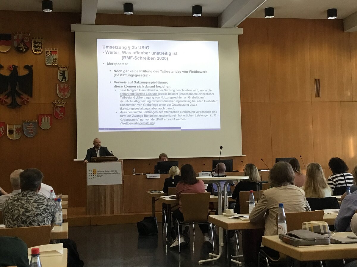 Selbst ein eher spezielles Friedhofsthema wie Umsatzsteuer und kalkulatorische Kosten bei Friedhofsgebühren wird dann doch relevant, wenn es heißt, dass Gebühren für Kühlraumnutzung, Trauerhallen und sonstige Aufbewahrungsleistungen deshalb keine Umsatzsteuerpflicht bei Kommunen auslösen, weil diese auch bei privaten Anbietern umsatzsteuerbefreit sind: Aha, sagt sich dazu der informierte Bestatter, bisher habe ich das immer mit 19 Prozent versteuert abgerechnet. Laut einem BMF-Schreiben vom 23.11.2020 verhält das sich nun aber anders! Professor Erik Gawel zeigte sich insoweit in seinem Vortrag auch überrascht angesichts der Leitidee, steuerliche Wettbewerbsneutralität zwischen öffentlichen und privaten Leistungserbringern durch eine Neuordnung der Umsatzsteuer bei Kommunen und anderen öffentlich-rechtlichen Körperschaften durch § 2b UStG herbeizuführen. Originäre öffentliche Leistungen sind davon nicht betroffen, aber solche, bei denen eine Behandlung als Nichtunternehmer zu größeren Wettbewerbsverzerrungen führen würde.