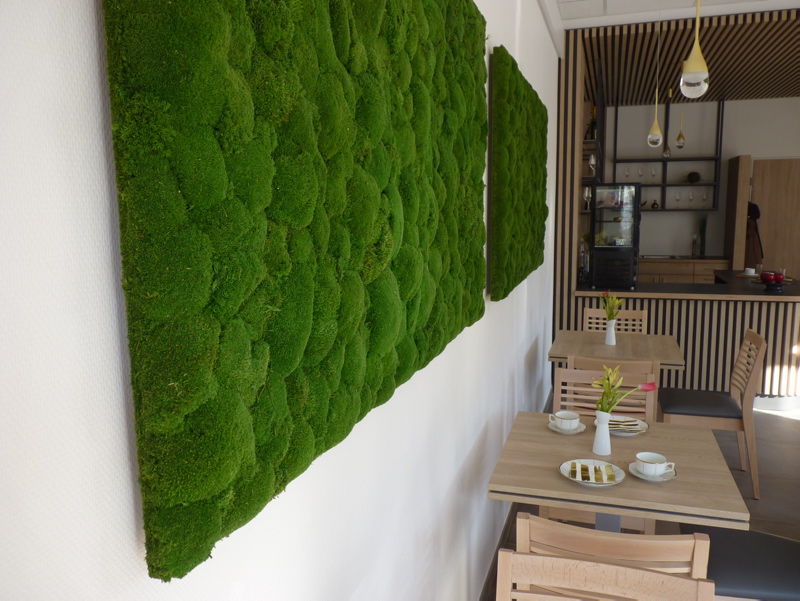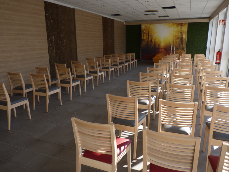 Und: Das Ambiente kann sich sehen lassen. Alles sehr hell und freundlich – und passend zur Waldumgebung ist erkennbar das Thema „naturnah“ in die Gestaltung eingeflossen. Die vornehm- zurückhaltende aber auch pfiffige Gestaltung des Innenausbaus des neuen L-förmigen Komplexes basiert auf Ideen der MDalheimer GmbH aus Saarbrücken-Klarenthal. Die frisch umfirmierte Schreinerei von Monika Dalheimer, ehemals Zeiher GmbH, hat hier ganze Arbeit geleistet. Ein paar Beispiele: An den Wänden gibt es auffallend schöne „Moosbilder“ zu bestaunen, die sofort ins Auge stechen, weil sie den ansonsten reinweiß getünchten Wänden als bewusstes Kontrastprogramm dienen und auf Anhieb eine Wohlfühlatmosphäre schaffen. Bei einer Trauerfeier vielleicht nicht ganz unwichtig. Der Clou: Es handelt sich bei den im Bildrahmen drapierten Gewächsen um echte Exemplare jener wurzellosen Sporenpflanze, die wir als immergrüne, polsterbildende Moospflanzen hauptsächlich von feuchten, schattigen Stellen am Boden, an Baumstämmen oder Steinen kennen. Auch in der Trauerhalle wird das Moos-Motiv wieder aufgegriffen, indem es an der Stirnwand das Riesenposter „Der letzte Weg“ naturnah einrahmt, was den Trauergästen – trotz allem Schmerz – guttun soll und wird. Nächstes Beispiel ist das geschickte Wechselspiel von glatten, deckenhohen Holzoberflächen mit großflächigen Pappelrinden-Elementen gegenüber der beeindruckenden Fensterfront, die das Gegenteil von Trauer und Düsternis vermitteln. Gute Idee! Gleiches gilt für die einheitliche Bestuhlung von Café und Trauerhalle, in der übrigens bis zu 80 Trauergäste einen Sitzplatz finden können. Das raffinierte an den Stuhlbezügen ist eine bewusst gewählte Zweifarbigkeit – die meisten zurückhaltend grau, ein paar aber sind in Rot gehalten. Warum? „Nun, wir möchten mit den roten Sitzen vorne den Besuchern intuitiv zeigen, wo die nahen Angehörigen ihre Plätze haben sollen“, verrät Uwe Kunzler das Geheimnis der roten und grauen Stuhlreihen.