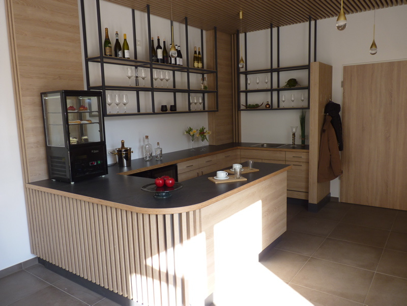Auch die kleine Küche mit Anrichte im hinteren Eck des Einraumcafés fällt wegen ihrer durchdachten Aufteilung und stimmigen Konzeption dem Besucher ins Auge: alles sehr transparent und praktisch-elegant. Das gilt übrigens für das ganze Gebäudeensemble, das sich durch seinen weißen Außenputz wohltuend von der roten Klinkerfassade des Krematoriums abhebt. Man könnte auch sagen: Das helle Gebäude ist für die menschlichen Trauerbedürfnisse gemacht, das dunkle für die notwendige Technik, die es für die immer mehr gefragte Feuerbestattung nun mal braucht.